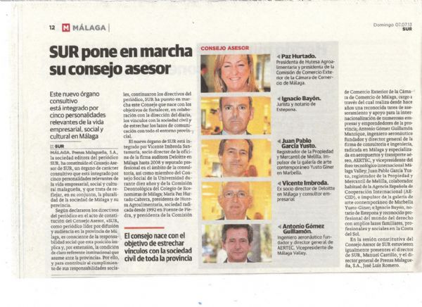 Prensa Malagueña, SA, la sociedad editora del periódico SUR, ha constituido el Consejo Asesor de SUR, un órgano de carácter consultivo que está integrado por cinco personalidades relevantes de la empresarial, social y cultural malagueña y que trata de reflejar, en su conjunto, la pluralidad de la sociedad de Málaga y su provincia.